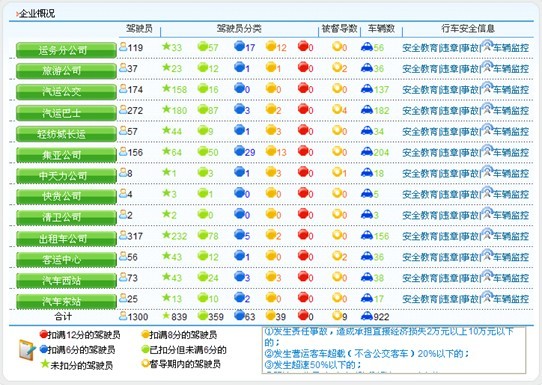 上图是该系统考核功能的集成画面,图中采用驾驶员扣分信息加亮显示方式,并根据相应制定了《驾驶员发生责任事故和违法违规记分处理办法》,对驾驶员电子档案在一个年度周期内记分累计记分达到以上各档分值时,系统自动分别以不同颜色亮灯显示识别,记分低于6分者显示绿灯、记分满6分者显示蓝灯、满8分者显示黄灯、满12分者显示红灯,使驾驶员的扣分情况一目了然,及时、全面地反映在岗运营车驾驶员的相关信息,科学、合理地评价驾驶员在岗工作适应情况,为实现驾驶员无事故辞退提供了科学的量化依据,把不安全隐患消灭在萌芽状态,使行车安全管理提升预先控制、预先干预的新阶段。 |